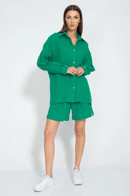 Костюм состоящий из рубашки и шорт. Нежная натуральная хлопковая ткань - муслин. Шорты свободного кроя с карманами в боковых швах. Рубашка свободного кроя со спущенными рукавами и накладным карманом. Ткань муслин. Рост 170.