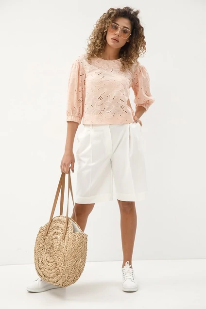 Современный комплект тщательно продуманными деталями. Сложные рукава блузки и ажурная хлопковая ткань, делают образ женственным. Сборка внизу рукава с эластичной тесьмой. Глубокий вырез на спинке с поперечной деталью, создают завершающий штрих. Шорты выполнены из ткани с большим содержанием хлопка. У пояса защипы, есть карманы. Шорты: длина по боковому шву с поясом 50 см . Блузка: длина от плеча 48см, длина рукава 38см, спущено плечо.