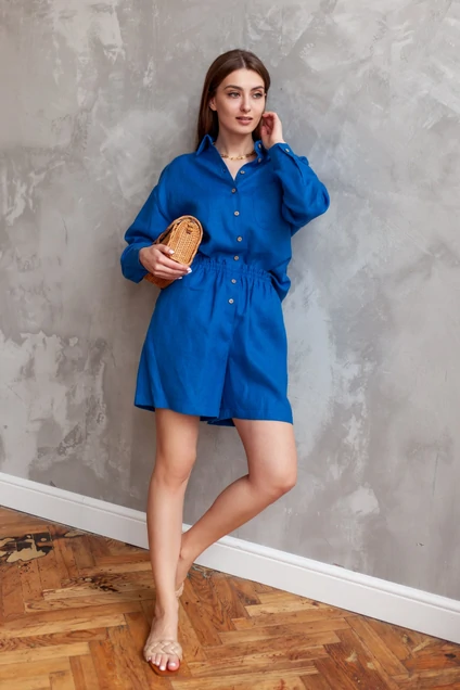 Костюм женский, состоящий из шортов и рубашки. Рубашка с накладным карманам и застежкой центральной на пуговицы. Воротник рубашечного типа, отложной с отрезной стойкой. Рукав длинный, одношовный. Низ рукава оформлен притачной манжетой на две пуговицы. По спинке кокетка с декоративными пуговицами, что придает изюминку костюму.