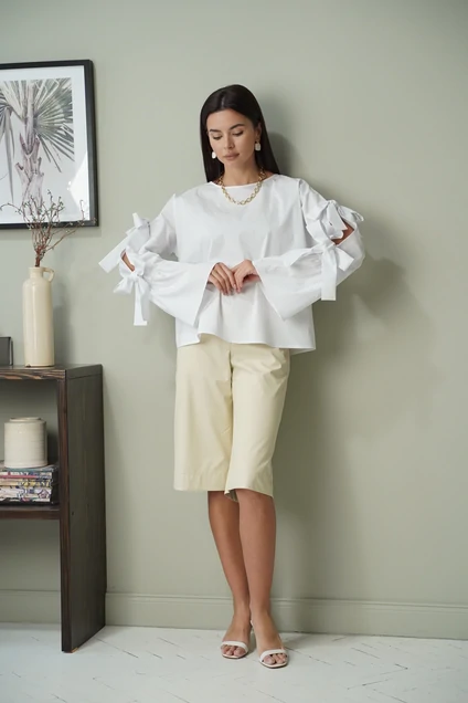 Комплект 2-ух предметный (шорты + блуза). Блуза прямая, без застёжки. Рукав цельнокроенный с разрезом по центру и двумя декоративными бантами. По низу рукава волан. Вырез горловины круглый, обработан косой бейкой. Шорты из кож.зама. По передней половинке карманы в подрезе. Застёжка по центру на молнию. Пояс шириной 5 см. Подгибка низа 5 см. Длина спущенного рукава от горловины 74 см. Длина блузы 58 см. Длина шорт 66 см.