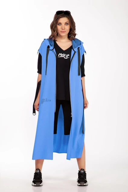 Комплект тройка из легкой стрейчевой ткани с «Крэш» эффектом. Удлиненные Шорты свободного силуэта на эластичном поясе, в боковых швах прорезные карманы. Блуза свободного силуэта рукав втачной укороченный на эластичной манжете. Горловина V-образной формы, по полочке декоративная аппликация. Жилет удлиненный под поя свободного силуэта, с капюшоном, застежка на молнию, в боковых швах высокие разрезы.
