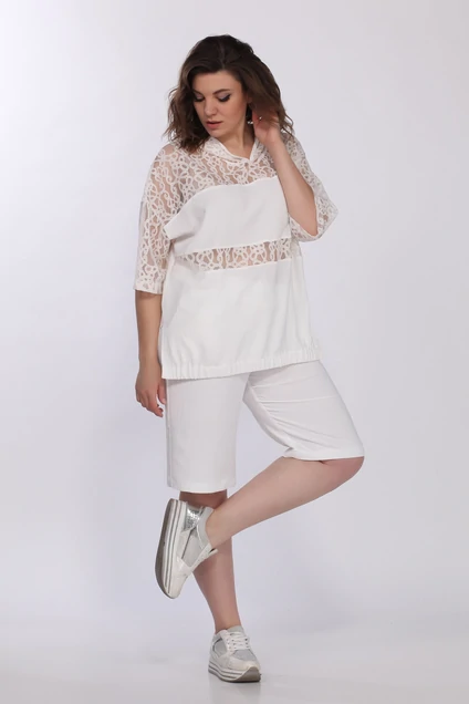 Летний костюм из легкой стрейчевой ткани и кружева в спортивном стиле. Джемпер с капюшоном свободного силуэта, рукав укороченный на спущенной пройме. Низ двухуровневый с разрезом, по переду легкая сборка на эластичной тесьме.