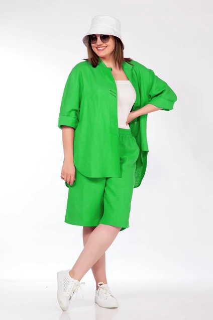 Брузон рубашечного типа из натурального умягченного льна, свободного силуэта, рукав втачной с манжетой, воротник стойка. Потайная застёжка на кнопки. Низ фигурный. Спинка на заниженной кокетке. И декоративной застрочной складкой.