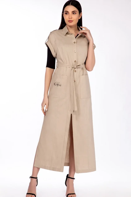 Удлиненный жилет из льна со сквозной застежкой по планке. Воротник на стойке. Сверху – кокетки, линия плеча приспущена, цельнокроенный короткий рукавчик, с отворачивающейся манжетой, пата, переходящая в погон зафиксирована пуговицами. Накладные карманы с декором печатью. По спинке кокетка и рельефы, по боковым швам высокие разрезы. Жилет дополнен поясом.