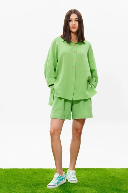 Стильный комплект, состоящий из свободной рубашки и шорт современного актуального кроя.