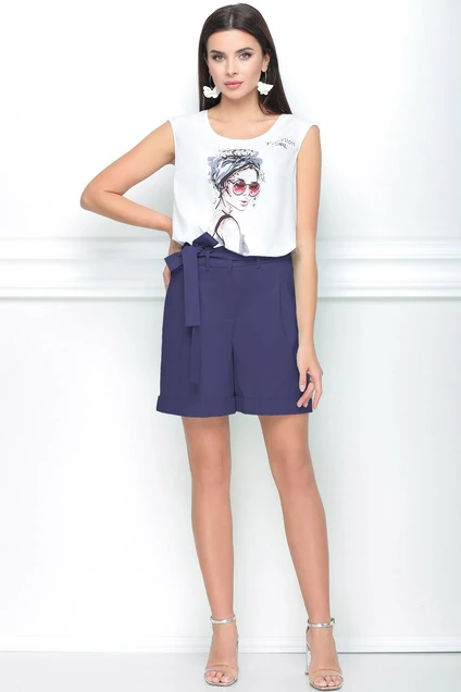 Комплект женский состоящий из блузки и шорт. Блузка женская полуприлегающего силуэта с круглым вырезом горловины, без рукава со спущенной линией проймы. По переду принт (сублимация) и в боковых швах разрезы. Шорты на притачном поясе со шлевками, немного расширенные к низу с отложными манжетами. По переду функциональные карманы хулиганы и складками. В комплект входит съемный пояс из основной ткани. Состав шорт: 62% хлопок, 35% нейлон, 3%спандекс (ткань костюмно-плательная)