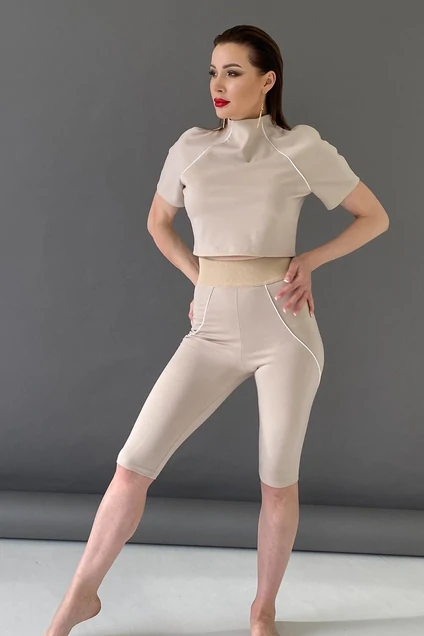 Тренд сезона! Модный костюм в спортивном стиле, состоит из спортивного топа и легинсов "велосипедки". Костюм с отделкой белого цвета по рельефам и боковым швам, что подчеркивает женский силуэт и делает вашу фигуру еще идеальнее. Цвет бежевый.