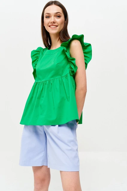 Блузка из хлопка свободного силуэта. Вырез горловины овальной формы, обработан отрезной планкой, с застежкой на петли и пуговицы по спинке. Блузка отрезная, с завышенной линии талии, со сборкой. Перед с нагрудными вытачками. Рукав - «крылышко».