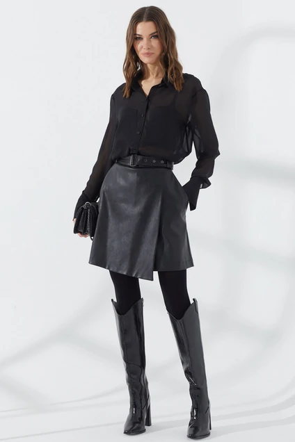 Стильный комплект состоит из блюзы и юбки-шорт. Стильная блузка прямого силуэта из шифона. Воротник рубашечного типа с застежкой на петли и пуговицы. По переду располагаются накладные карманы. Рукав со спущенной линией плеча, по низу манжет с застежкой на петлю и пуговицу. Спинка по линии низа немного длиннее переда. Стильная юбка-шорты прямого силуэта расклешенная книзу из экокожи на хлопковой основе. По верху притачной пояс с застежкой на спинке на потайную молнию и шлевками для ремня. Передние половинки с наклонными карманами. На задних половинках вытачки с декоративными листочками. В комплект входит пояс с пряжкой и блочками. Длина изделия: 71 см (42-48р), 73 см (50-54р), 75 см (56-60р)