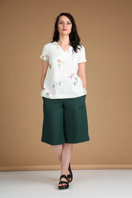 Комплект женский состоит из блузки и шорт. Блузка прямого силуэта, с V- образным вырезом горловины, спинка из двух деталей, с запахом от плеча. Рукав втачной. Брюки-бермуды прямого силуэты из льняной ткани с отрезной кокеткой по линии талии. Застежка гульфик. В боковых швах обработаны карманы в отрезном бочке.