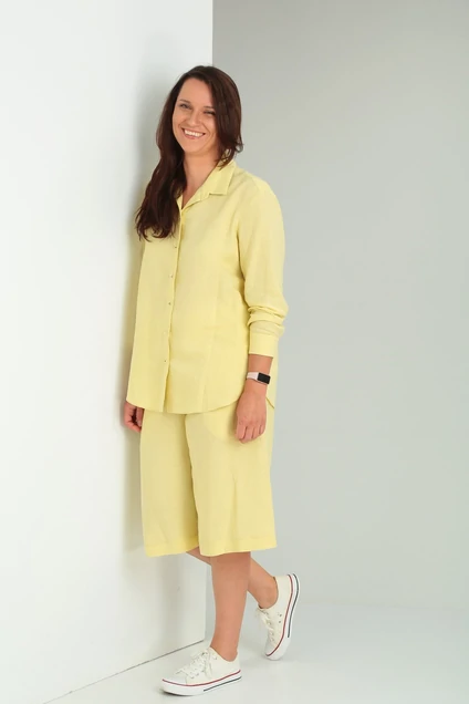 Рубашка свободного силуэта с длинным рукавом. По переду застежка на петли-пуговицы. В верхней части спинки кокетка. Воротник со стойкой, по низу рукава отрезная манжета. Длина от шва притачивания воротника до линии низа 77 см., длина рукава 62см.. Бермуды прямого силуэта с боковыми карманами, застежкой -гульфиком и отрезной кокеткой по линии талии шириной 9 см.. Длина от верхнего края кокетки до низа 69 см..