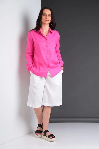 Комплект двухпредметнй состоит из рубашки и брюк.Рубашка свободного силуэта с длинным рукавом. По переду застежка на петли-пуговицы. В верхней части спинки кокетка. Воротник со стойкой, по низу рукава отрезная манжета. Длина от шва притачивания воротника до линии низа 77 см., длина рукава 62см.. Бермуды прямого силуэта с боковыми карманами, застежкой -гульфиком и отрезной кокеткой по линии талии шириной 9 см.. Длина от верхнего края кокетки до низа 69 см..