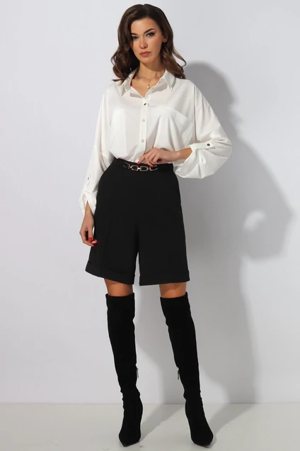 Костюм женский состоит из блузки и шорт.Блузка прямого силуэта с застёжкой на петли и пуговицы.На полочке накладные карманы.По горловине отложной воротник на отрезной стойке.Линия плеча спущена.Рукав рубашечного типа с застёжкой на пату.Состав блузки:Пэ 83%, спандекс 17%. Шорты классической посадки на притачном поясе.По линии талии декоративная цепочка.Низ на манжете. На спинке застёжка на потайную тесьму молния. Длина блузки 64см.Длина рукава в расстегнутом виде 77 см ( с застёжкой на пату 59 см, длину рукава можно регулировать пуговицей)Длина шорт от пояса 47 см. Изделие подойдет на рост 164-170 см.