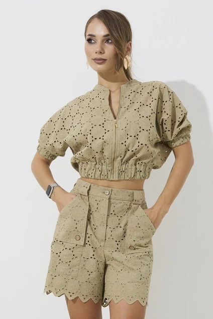 Костюм женский состоит из блузки и шорт.Блузка укороченная,на резинке по линии талии Застежка на декоративную тесьму молния.По горловине плосколежащий воротник - стойка.Рукав короткий, низ обработан манжетой на резинке.Шорты на подкладке классической посадки,с накладными карманами.Застёжка на тесьму молния.Длина блузки(бомбера) 47 см,длина рукава от начала горловины 42 см.Длина шорт 45 см.Цвет:оливковый