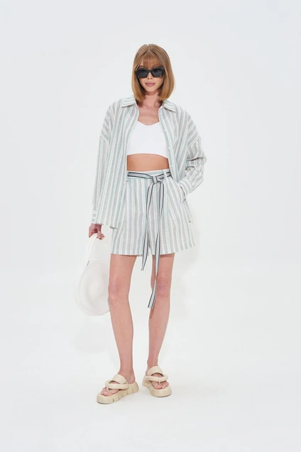 Костюм двойка свободного силуэта. Рубашка с длинным рукавом. Застежка на пуговицы. Шорты со стабильным поясом. В боковых швах карманы. Ремень в комплекте.