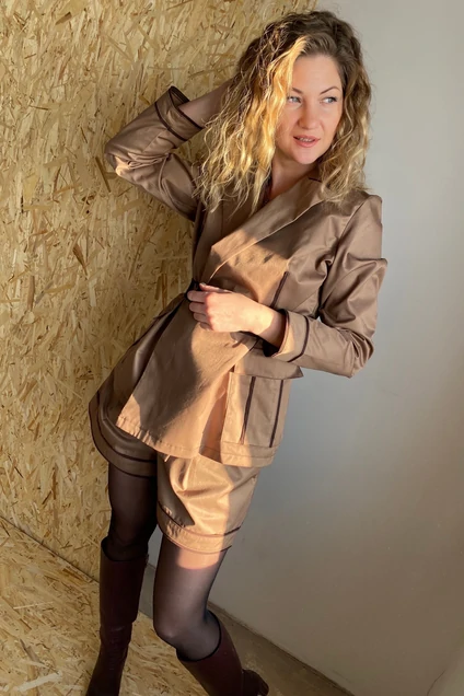 Костюм в стиле сафари. Жакет свободного кроя на запах с лацканами.