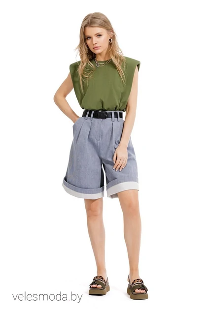 Бермуды с высокой посадкой на широком притачном поясе со шлевками, передние половины с глубокими складками, застежка на молнию и пуговицу, карманы в боковых швах