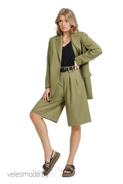 Текстильный костюм-тройка из оверсайз жакета мужского покроя, топа в бельевом стиле и свободных шорт-бермуд с высокой посадкой.