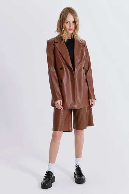 Костюм-двойка из двубортного жакета свободного покроя и шорт-бермуд из экокожи. Детали: прямой силуэт, пиджачный воротник, прорезные карманы, спинка со средним швом, втачные двухшовные рукава. Шорты с высокой посадкой на притачном поясе, задняя часть пояса с резинкой, застежка на молнию и пуговицу, боковые карманы