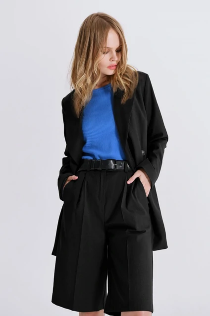Костюм-двойка из двубортного жакета свободного покроя и шорт-бермуд. Детали: прямой силуэт, пиджачный воротник, прорезные карманы, спинка со средним швом, втачные двухшовные рукава. Шорты с высокой посадкой на притачном поясе, задняя часть пояса с резинкой, застежка на молнию и пуговицу, боковые карманы