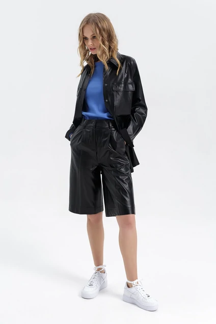 Костюм-двойка из свободной рубашки и бермуд из экокожи. Детали: рубашка прямого силуэта, накладные карманы, нагрудные вытачки, рубашечный воротник, кокетка спинки, застежка на кнопки, рукава длинные на манжетах, фигурный низ. Бермуды с высокой посадкой на притачном поясе, задняя часть пояса с резинкой, перед со складками, застежка на молнию и пуговицу, боковые карманы, шлевки