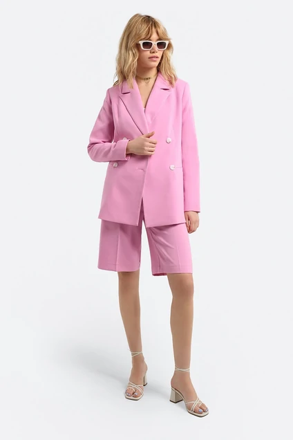 Текстильный костюм-двойка из двубортного жакета свободного покроя и шорт-бермуд. Детали: прямой силуэт, пиджачный воротник, прорезные карманы, спинка со средним швом, втачные двухшовные рукава. Шорты с высокой посадкой на притачном поясе, задняя часть пояса с резинкой, застежка на молнию и пуговицу, боковые карманы