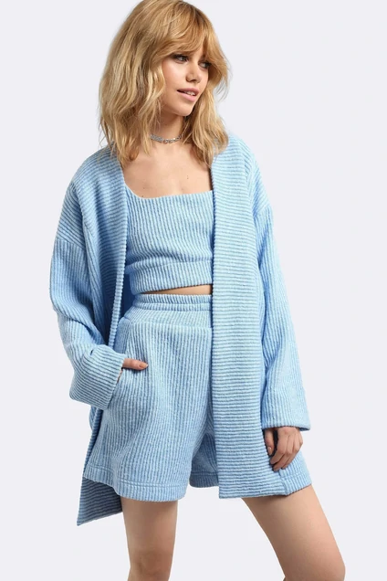 Трикотажный костюм-тройка из свободного кардигана, облегающего топа и коротких шорт. Детали: кардиган прямого силуэта, спущенная линия плеча, длинные рукава, без застежки. Шорты с высокой посадкой, пояс на резинке, боковые карманы. Топ с фигурным кареобразным вырезом, низ переда и спинки с резинкой. Костюм на тонкой трикотажной подкладке