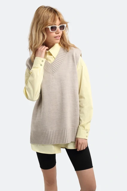 Комплект-двойка из вязаного жилета и облегающих трикотажных шорт-велосипедок. Детали: прямой силуэт, спущенная линия плеча, V-образный вырез горловины переда, перед и спинка разной длины с небольшими разрезами по бокам. Шорты из плотного трикотажного полотна с высокой посадкой, пояс на резинке