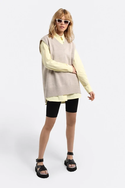 Комплект-тройка из вязаного жилета, хлопковой свободной рубашки и облегающих трикотажных шорт-велосипедок. Детали: жилет прямого силуэта, спущенная линия плеча, V-образный вырез горловины переда, перед и спинка разной длины с небольшими разрезами по бокам. Рубашка прямого силуэта со спущенной линией плеча, рубашечный воротник, потайная застежка на петли и пуговицы, кокетка переда и спинки, рукава длинные с манжетами. Шорты из плотного трикотажного полотна с высокой посадкой, пояс на резинке