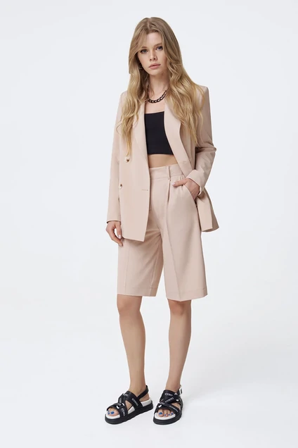 Текстильный костюм-тройка из двубортного жакета, шорт-бермуд и трикотажного топа. Детали: прямой силуэт, пиджачный воротник, прорезные карманы, спинка со средним швом, втачные двухшовные рукава. Топ с нагрудными вытачками, кареобразный вырез переда и спинки, низ переда и спинки с резинкой, топ на подкладке. Шорты с высокой посадкой на притачном поясе, задняя часть пояса с резинкой, застежка на молнию и пуговицу, боковые карманы