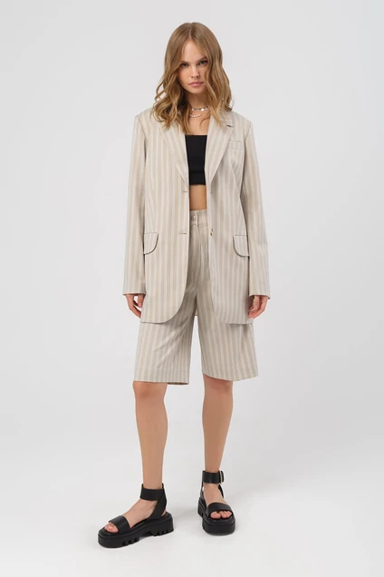 Текстильный костюм-двойка из однобортного жакета свободного покроя и шорт-бермуд. Детали: жакет с расширенной линией плеча, полуприлегающий силуэт, пиджачный воротник, талиевые вытачки, перед с функциональным нагрудным карманом и двумя прорезными карманами с клапанами, застежка на пуговицы, спинка со средним швом, рукава втачные двухшовные, жакет на подкладке. Шорты с высокой посадкой на притачном поясе со шлевками, задняя часть пояса с резинкой, застежка на молнию и пуговицу, боковые карманы