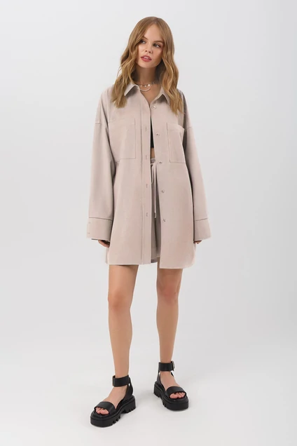 Костюм-двойка из платья-рубашки покроя оверсайз и свободных шорт. Детали: рубашка прямого силуэта, спущенная линия плеча, накладные карманы, рубашечный воротник, застежка на пуговицы, рукава длинные с манжетами, фигурный низ с разрезами по бокам. Шорты свободного силуэта, высокая посадка, притачной эластичный пояс, боковые карманы