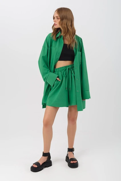 Костюм-двойка из платья-рубашки покроя оверсайз и свободных шорт. Детали: рубашка прямого силуэта, спущенная линия плеча, накладные карманы, рубашечный воротник, застежка на пуговицы, рукава длинные с манжетами, фигурный низ с разрезами по бокам. Шорты свободного силуэта, высокая посадка, притачной эластичный пояс, боковые карманы