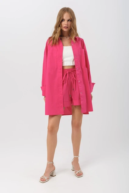 Хлопковый костюм-двойка из платья-рубашки покроя оверсайз и свободных шорт. Детали: рубашка прямого силуэта, спущенная линия плеча, накладные карманы, рубашечный воротник, застежка на пуговицы, рукава длинные с манжетами, фигурный низ с разрезами по бокам. Шорты свободного силуэта, высокая посадка, притачной эластичный пояс, боковые карманы