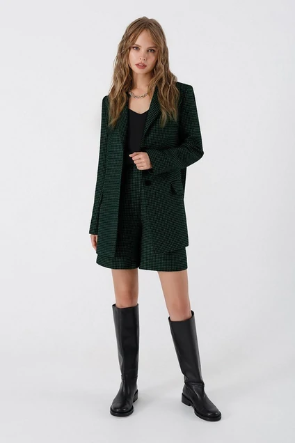 Текстильный костюм-двойка из трапециевидного жакета свободного покроя и высоких шорт из полушерстяной ткани с рисунком «гусиная лапка». Детали: пиджачный воротник, талиевые вытачки, перед с функциональным нагрудным карманом и двумя прорезными карманами, застежка на пуговицы, спинка со средним швом и высокой шлицей, рукава втачные двухшовные, жакет на подкладке. Шорты с высокой посадкой, застежка на потайную молнию сзади, боковые карманы