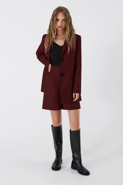 Текстильный костюм-тройка из трапециевидного жакета свободного покроя, топа в бельевом стиле и высоких шорт. Детали: пиджачный воротник, талиевые вытачки, перед с функциональным нагрудным карманом и двумя прорезными карманами, застежка на пуговицы, спинка со средним швом и высокой шлицей, рукава втачные двухшовные, жакет на подкладке. Топ прямого силуэта, нагрудные вытачки, V- вырез переда и спинки, регулируемые бретели по длине. Шорты с высокой посадкой, застежка на потайную молнию сзади, боковые карманы. Жакет и шорты выполнены из полушерстяной ткани с рисунком «гусиная лапка»