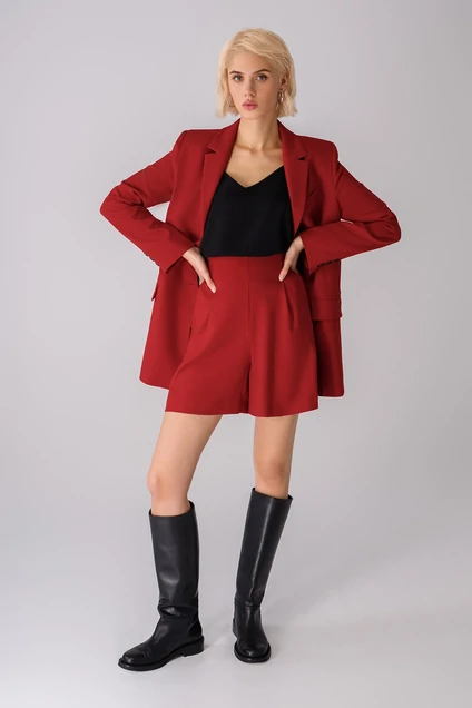 Текстильный костюм-тройка из трапециевидного жакета свободного покроя, топа в бельевом стиле и высоких шорт. Детали: пиджачный воротник, талиевые вытачки, перед с функциональным нагрудным карманом и двумя прорезными карманами, застежка на пуговицы, спинка со средним швом и высокой шлицей, рукава втачные двухшовные, жакет на подкладке. Топ прямого силуэта, нагрудные вытачки, V- вырез переда и спинки, регулируемые бретели по длине. Шорты с высокой посадкой, застежка на потайную молнию сзади, боковые карманы