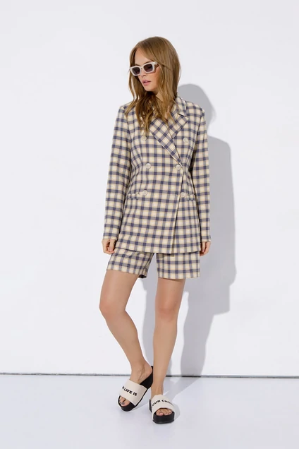 Текстильный костюм-двойка из двубортного жакета свободного покроя и свободных шорт со складками. Детали: жакет прямого силуэта, пиджачный воротник, прорезные карманы, спинка со средним швом, втачные двухшовные рукава, жакет на подкладке. Шорты с высокой посадкой на притачном поясе со шлевками, задняя часть пояса с резинкой, передние половины с небольшими застроченными мягкими складками, застежка на молнию и пуговицу, боковые карманы