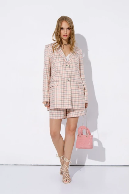 Текстильный костюм-двойка из трапециевидного жакета свободного покроя и высоких шорт. Детали: пиджачный воротник, талиевые вытачки, перед с функциональным нагрудным карманом и двумя прорезными карманами, застежка на пуговицы, спинка со средним швом и высокой шлицей, рукава втачные двухшовные, жакет на подкладке. Шорты с завышенной линией талии, застежка на потайную молнию сзади, боковые карманы