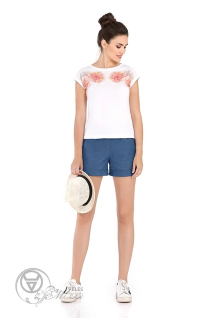 Повседневный комплект-двойка из трикотажной майки с принтом и джинсовых шорт с отворотами. Детали: майка с цельнокроеными рукавами и притачными манжетами, круглый вырез горловины; шорты на притачном поясе с резинкой по задним частям, перед с двумя небольшими складками и боковыми карманами Длина майки по спинке: 42-46=56,5 см, 48-52=58 см Длина шорт с поясом по боковому шву: 42-46=38 см, 48-52=42 см