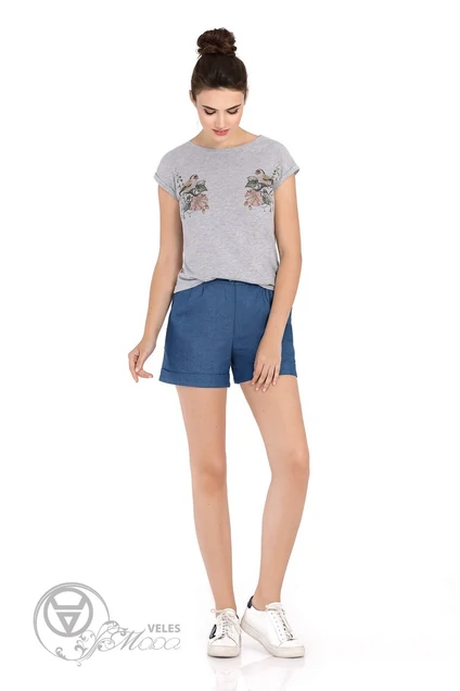 Повседневный комплект-двойка из трикотажной майки с принтом и джинсовых шорт с отворотами. Детали: майка с цельнокроеными рукавами и притачными манжетами, круглый вырез горловины; шорты на притачном поясе с резинкой по задним частям, перед с двумя небольшими складками и боковыми карманами Длина майки по спинке: 42-46=56,5 см, 48-52=58 см Длина шорт с поясом по боковому шву: 42-46=38 см, 48-52=42 см
