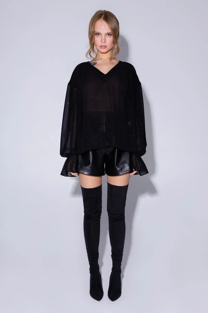 Комплект-двойка из свободной полупрозрачной блузы с блеском и мини-шорт из экокожи. Детали: блуза трапециевидного силуэта, спущенная линия плеча, V-образный вырез горловины переда, кокетка переда и спинки, без застежки, рукава пышные удлиненные с резинкой по низу. Шорты с высокой посадкой, шлевки, декоративный пояс с застежкой на кнопки, кокетка переда с застежкой на металлическую молнию, талиевые вытачки по спинке, фигурный низ.