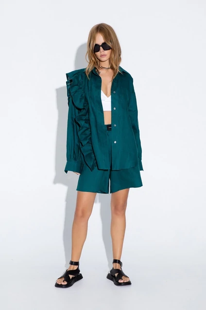 Льняной костюм- двойка из свободной рубашки с воланом и широких шорт