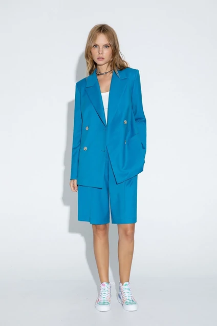 Текстильный костюм-двойка из двубортного жакета и шорт-бермуд
