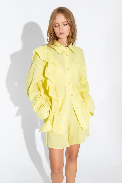 Костюм-двойка из свободной рубашки с воланом и шорт из облегченной хлопковой ткани