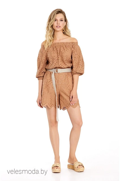 Хлопковый комплект-двойка из укороченной блузы свободного покроя и шорт с высокой посадкой. Детали: верх переда, спинки и низа на резинке; рукава объемные длиной 7/8 с широкой резинкой по низу, блузу можно носить с открытыми плечами и с закрытыми плечами; шорты на притачном поясе с эластичной резинкой, карманы в боковых швах, на подкладке
