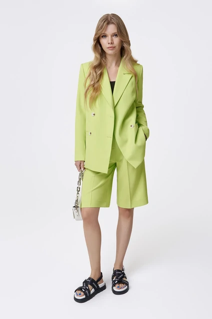 Текстильный костюм-двойка из двубортного свободного жакета и шорт-бермуд. Детали: прямой силуэт, пиджачный воротник, прорезные карманы с листочкой, застежка на петли и пуговицы, спинка со средним швом, втачные двухшовные рукава, жакет на подкладке; шорты с высокой посадкой, на притачном поясе со шлевками и резинкой по задней части, передние половины с заутюженными стрелками и складками, застежка на молнию и пуговицу, карманы в боковых швах
