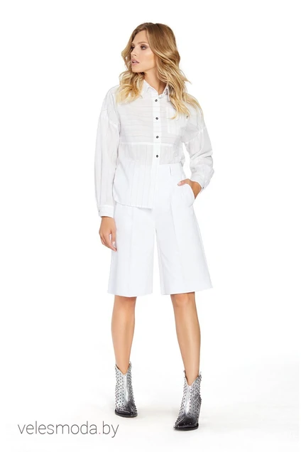 Текстильный комплект-двойка из свободной хлопковой рубашки в тонкую полоску и джинсовых шорт-бермуд. Детали: рубашка прямого силуэта со спущенной линией плеча, перед с нагрудным карманом и пришивным декором, застежка на петли и декоративные пуговицы, рукава длинные на манжетах, низ фигурный с разрезами; шорты с высокой посадкой, на притачном поясе со шлевками и резинкой по задней части, передние половины с заутюженными стрелками и складками, застежка на молнию и пуговицу, карманы в боковых швах. Шорты- 96% хлопок 4% эластан.