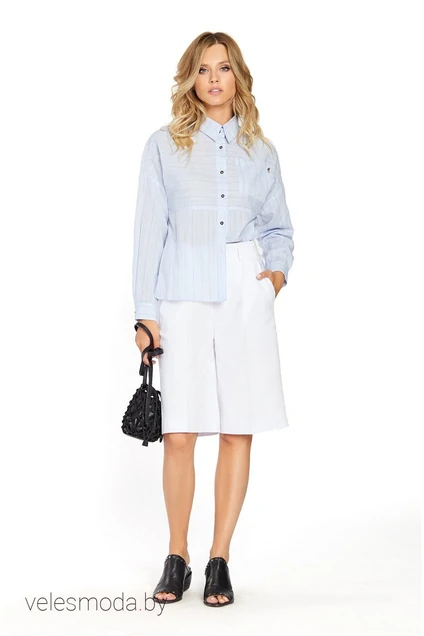 Текстильный комплект-двойка из свободной хлопковой рубашки в тонкую полоску и джинсовых шорт-бермуд. Детали: рубашка прямого силуэта со спущенной линией плеча, перед с нагрудным карманом и пришивным декором, застежка на петли и декоративные пуговицы, рукава длинные на манжетах, низ фигурный с разрезами; шорты с высокой посадкой, на притачном поясе со шлевками и резинкой по задней части, передние половины с заутюженными стрелками и складками, застежка на молнию и пуговицу, карманы в боковых швах. Шорты- 96% хлопок 4% эластан.