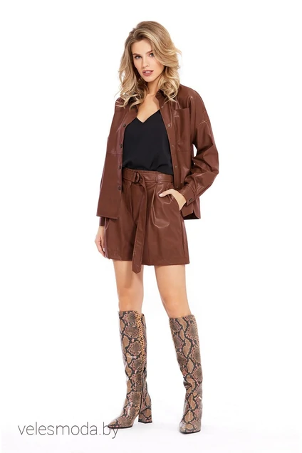 Костюм-двойка из свободной рубашки и шорт из экокожи.